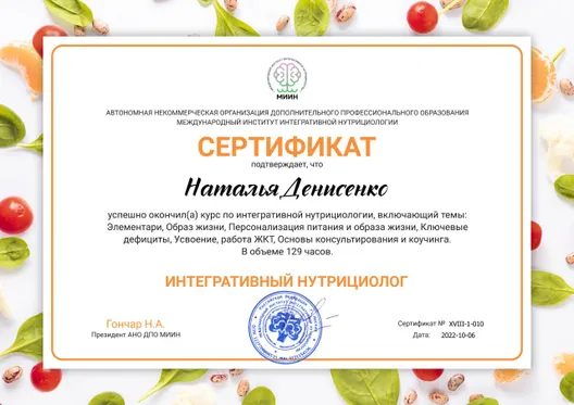 интегративный и клинический нутрициологМой путь начался с личного опыта. Когда традиционная медицина не давала мне улучшений и ясных ответов, я обратилась к нутрициологу. Мне удалось изменить свою жизнь: я сбалансировала обмен веществ, похудела на 25 кг, научилась жить без желчного пузыря — без страданий и ограничений. Забыла про костыли, с помощью которых передвигалась последние полтора месяца и поняла, что есть другой путь.